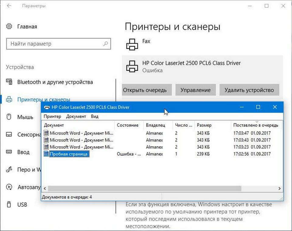 Через диспетчер печати